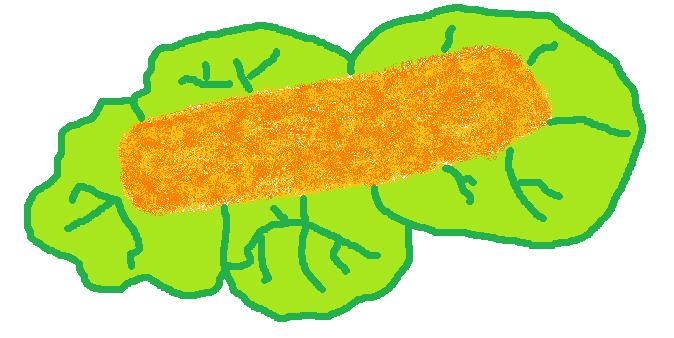 Tekeningen van de vleeskroket liefhebbers.Een artistieke impressie van een vleeskroket op wat blaadjes sla. Genaamd: Vleeskroket op sla.